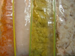 1/5 こしろの離乳食。こうやって作っては小分けして冷凍保存。今のところ好き嫌いなく食べてくれるので助かってます(^^) 最近は親が食べているものも気になるらしく、じ〜っと見つめられるので食べずらい(^_^;) ちなみに左から、にんじん、おかゆ、かぼちゃ、たら。 |