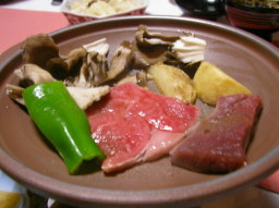 陶板焼き!なかなか美味しいお肉♪ほかにも刺身や、小料理が何品もあって、それはもう満腹で満腹で。 |