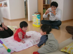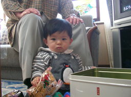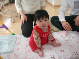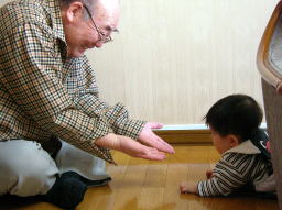 じいちゃんとズリ這いの練習をパチリ。 ビミョウに下がってくんだよねw。 |