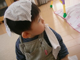 こしろはおすわりを誉めてもらっちゃった。 ところで、くわえているのはともかく、頭に載せたのは自力ではあるまい。 (犯人はしろくないやつに違いない) |