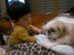 網走に到着! メグと仲良くしたいこしろ。警戒するメグ。 |