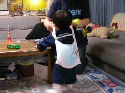 なんとこしろ、もちを前後に背負ったまま ハイハイで移動した挙句、つかまり立ち! まさか、餅の存在に気づいてないのか…。 |