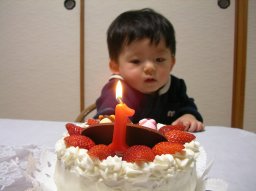 最近はこんな形のロウソクがあるんだね〜。 (昔からあったの?) さっそく味見をする主役。興味津々♪ |