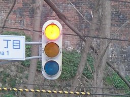 4/29 目で見ると、上から赤・黄色・青の順番なのに、デジカメで写すとご覧のとおり。これはきっと不思議信号だ。 |