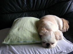 ひととおり歓迎のお愛想をして疲れたのか枕に擬態するメグ。そのまま午睡。