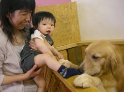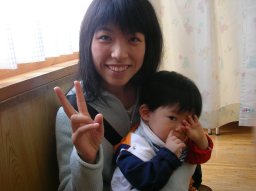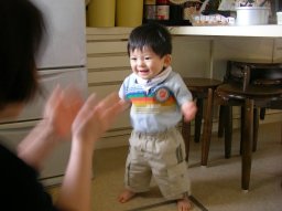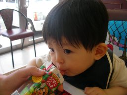 こしろ、りんごジュース初体験! このあとグレープフルーツジュースを飲んで 変な顔してました(^^) |