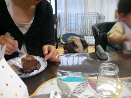 「もも」も相変わらず元気。ケーキを食べるきいろの隣でしっかり待機。