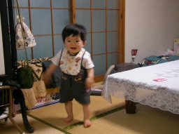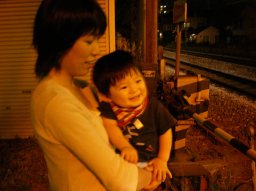 帰り道の踏切にて。電車に喜ぶこしろ。