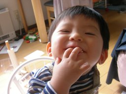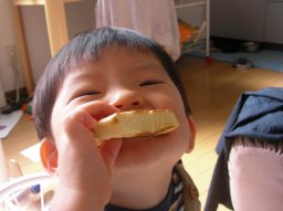 とうちゃんが悪かった(?)ということで、大きめのをあげたらこの笑顔、やれやれ(^_^;) |