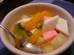 デザートのフルーツポンチ。 紅白寒天って正月っぽいとかぽくないとか…。 |