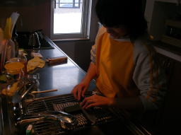 包丁を研ぐ女。やや逆光。