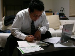 4/20 保険の相談のため黒い人に来てもらう。 今日は仕事なので、と、律儀にネクタイ姿。 |