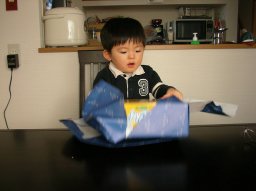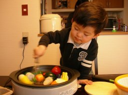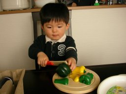 お料理セット!さっそく張り切って調理開始! 日頃、親が作るのを見ているせいか、なかなかの 手つき。ちなみにまないたもセットでした。 |